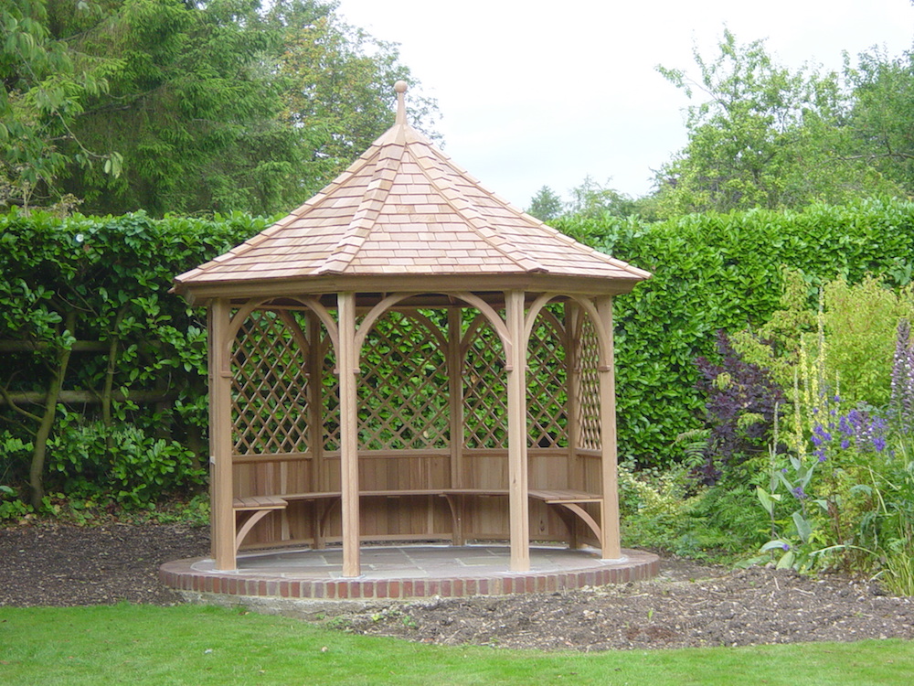 For a concrete base, once again the area should be stripped of any turf or planting, with excavation extending below ground level, giving consideration to the incorporation of a damp proof membrane (dpc). The sub-ground area should be filled with compacted hard-core, scalping’s or brick rubble to act as a sound foundation for your garden building. The base area should then be accurately set out and shuttered (using timber rails or steel shuttering) to a minimum depth of 4″ (100mm) and to a plan size no less than that of the building. Remember to check the shuttering profile is level and the diagonals are equal. The shuttered area can now be flood-filled with concrete, making sure the concrete is well spread and tamped down across the shuttering. Finish the top edge (4″-6″ wide) by trowel to provide a smooth surface for the proposed building to sit, especially if a metal, base railed product. Cover the base with supported polythene to drain rainwater away.