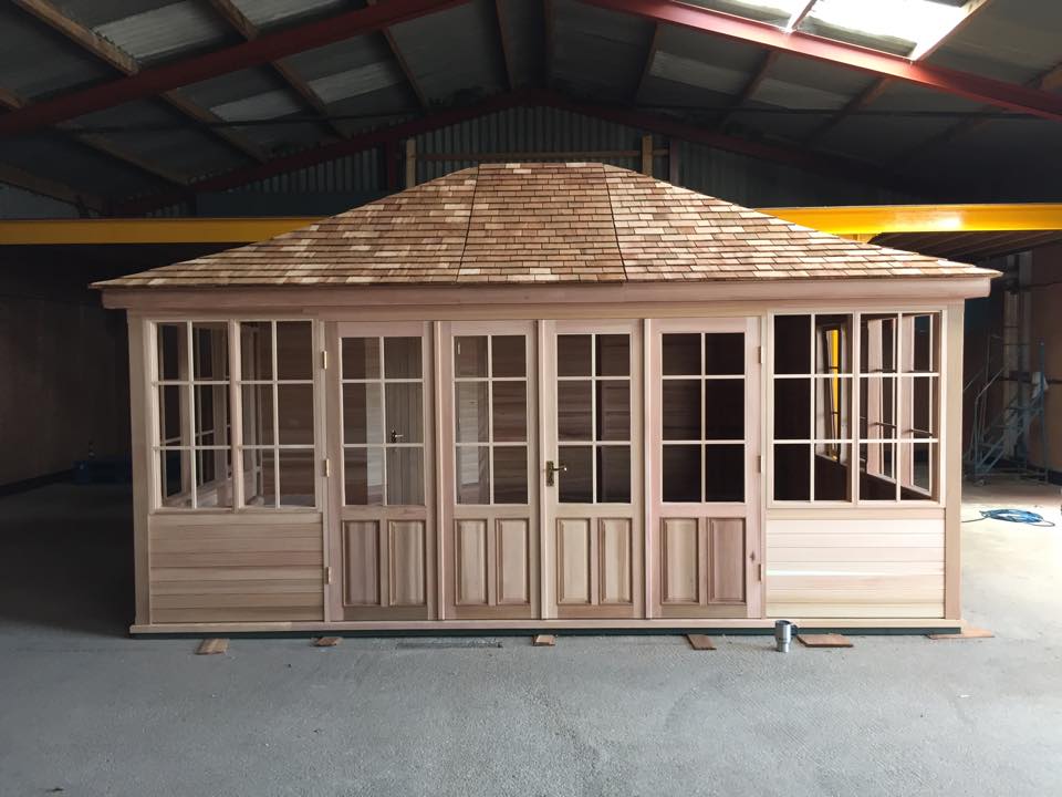 The summerhouse is a 5m x 4m with bi-fold doors. The summerhouse features an internal storage bench and changing room.